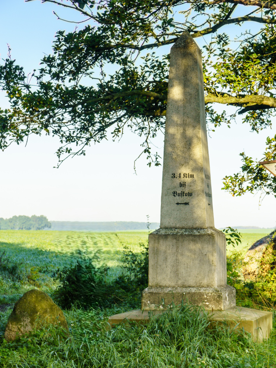 Es handelt sich hier um einen kleinen Obelisk, der als Distanzsäule Anfang des 19. Jahrhunderts von Friedrich von Zieten (1765-1854), dem Sohn des Husarengenerals, am damals viel benutzten Weg nach Buskow und Treskow/Neuruppin errichtet wurde. Friedrich war ab 1800 Landrat des Kreises Ruppin.